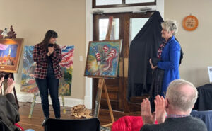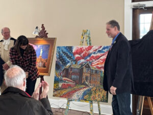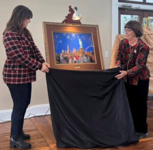 Four paintings celebrating the 250th anniversary of the founding of the United States were unveiled on Saturday, featuring the creativity of three Pittsburgh artists – Maria De Simone Prascak, Johno Prascak, and myself. Each painting (commissioned by the Bethel Park Community Foundation) tells a story of some of the best aspects of our country. As with my painting of “Our Lady of Liberty,” Maria’s painting of the eagle flying upward and forward symbolizes the strength, optimism, resiliency, hope, and joyful inspiration that our country was founded on.